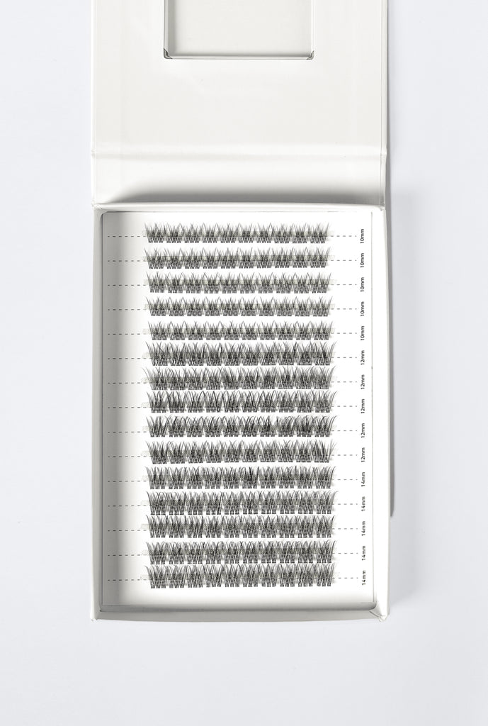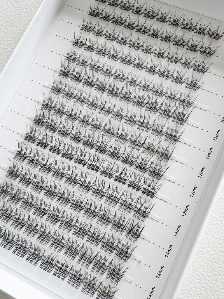 Cluster 0.1 - 7mm in width, C curl w/ a clear invisible band. Three sections of wispy fluffy fibres, the middle section being the longest of the three which gives the a natural real looking lash.
