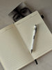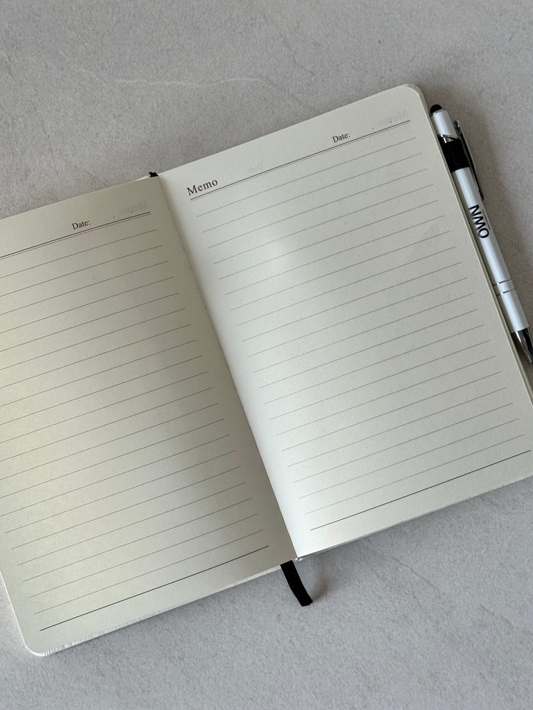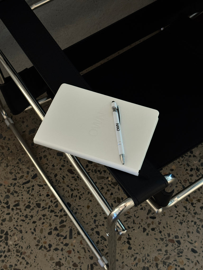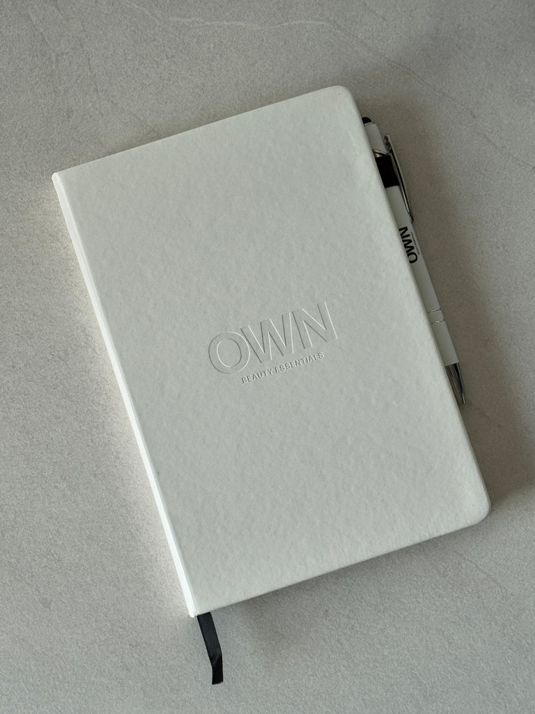 Vegan PU A5 white leather, embossed w/ 192 plain pages. Comes with your OWN black ball point matching pen.